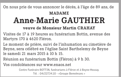 Veuve de Madame Martin CRAHAY