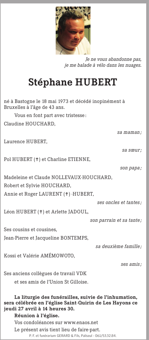 Décédé à Bruxelles (1000) le lundi 24 avril 2017 à l'âge de 43 ans