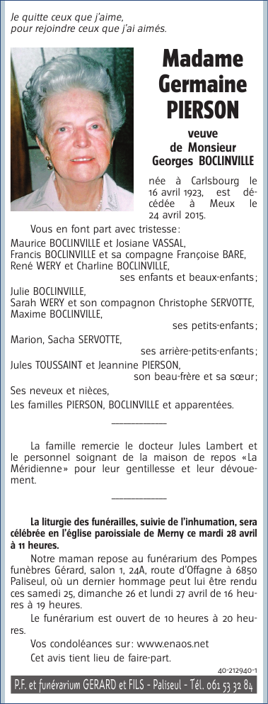 Décédée à Meux (5081) le vendredi 24 avril 2015 à l'âge de 92 ans