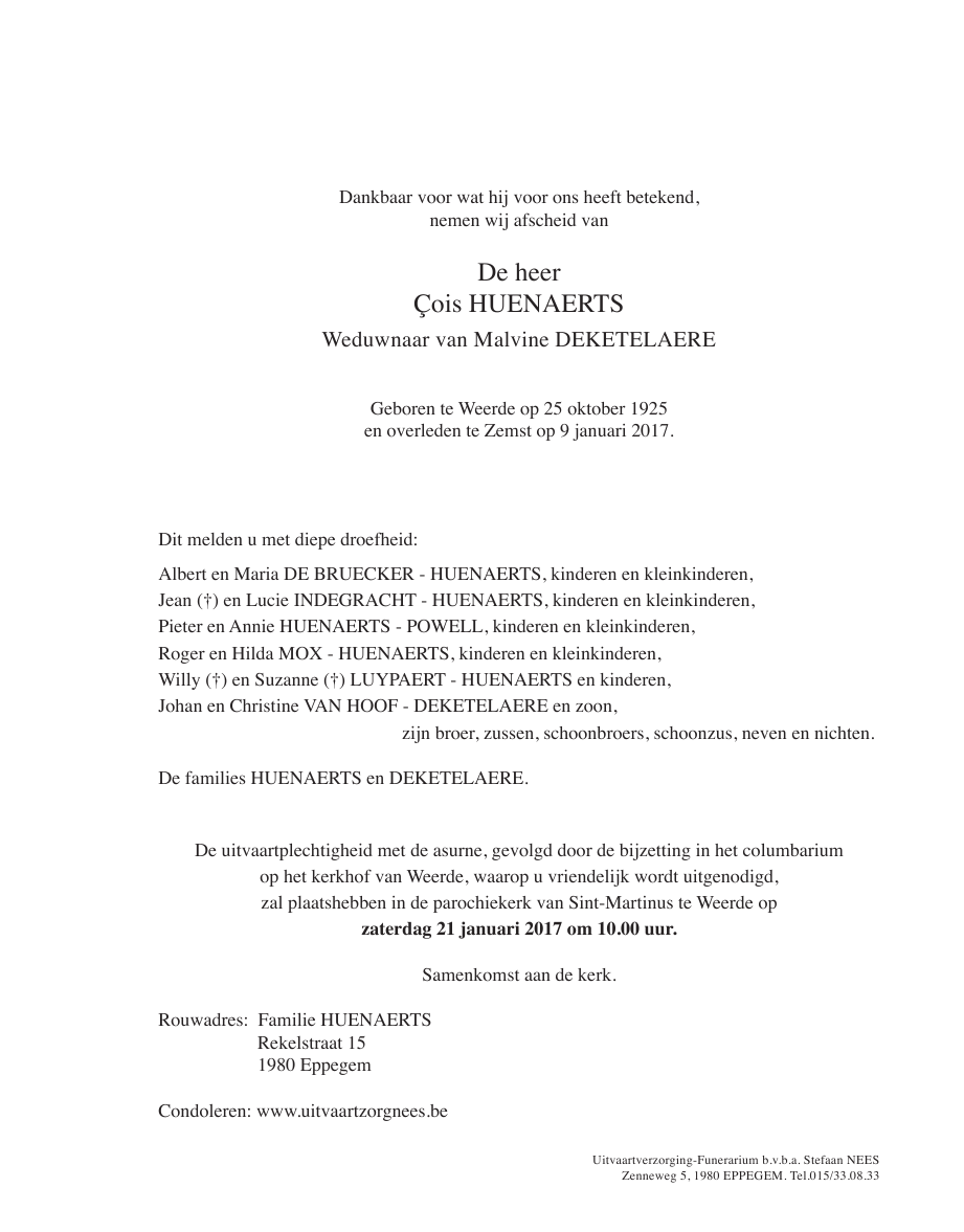 Fallecido en Zemst (1980) el lunes, 9 de enero de 2017 a la edad de 91 años