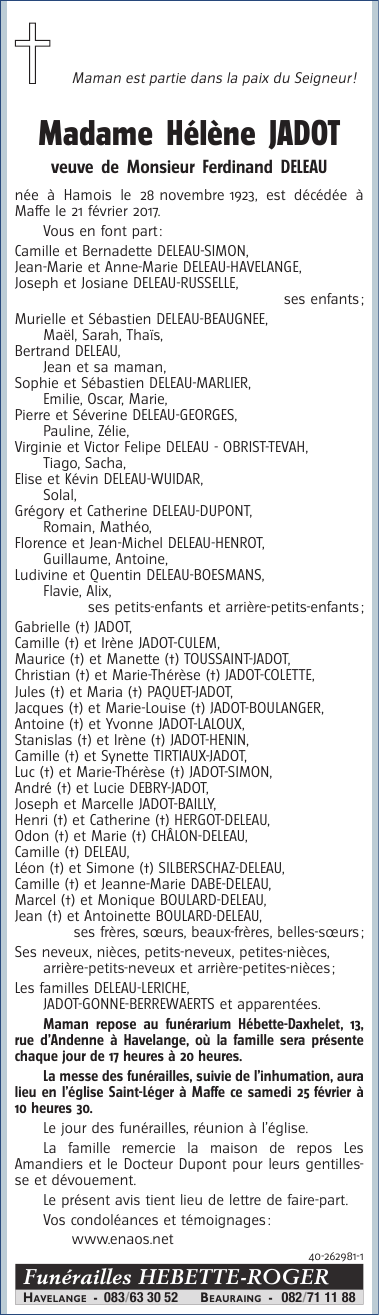 Décédée à Maffe (5374) le mardi 21 février 2017 à l'âge de 93 ans