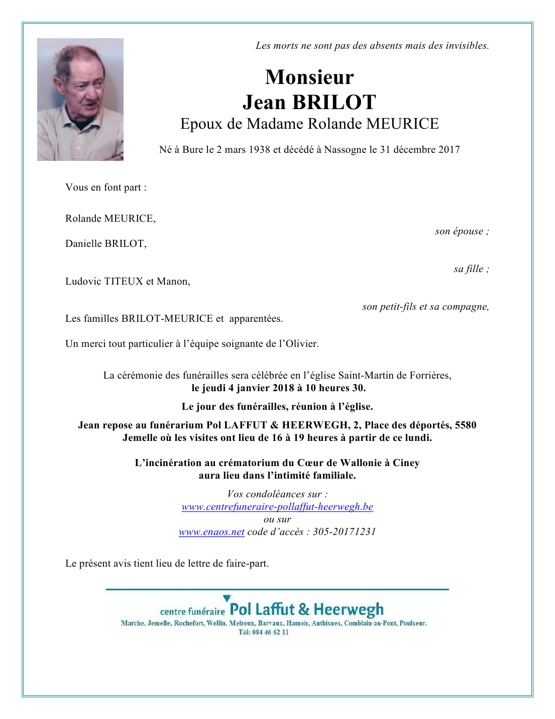 Fallecido en Nassogne (6950) el domingo, 31 de diciembre de 2017 a la edad de 79 años