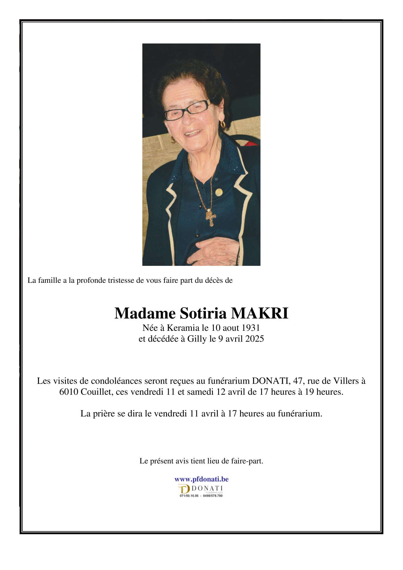 Décédée à Gilly (6060) le mercredi 9 avril 2025 à l'âge de 93 ans
