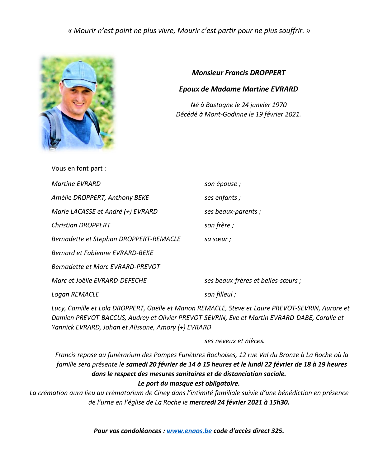 Décédé à Mont-Godinne (5530) le vendredi 19 février 2021 à l'âge de 51 ans