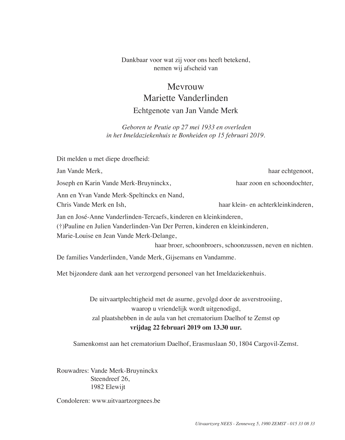 Epouse de de heer Jan Vande Merk