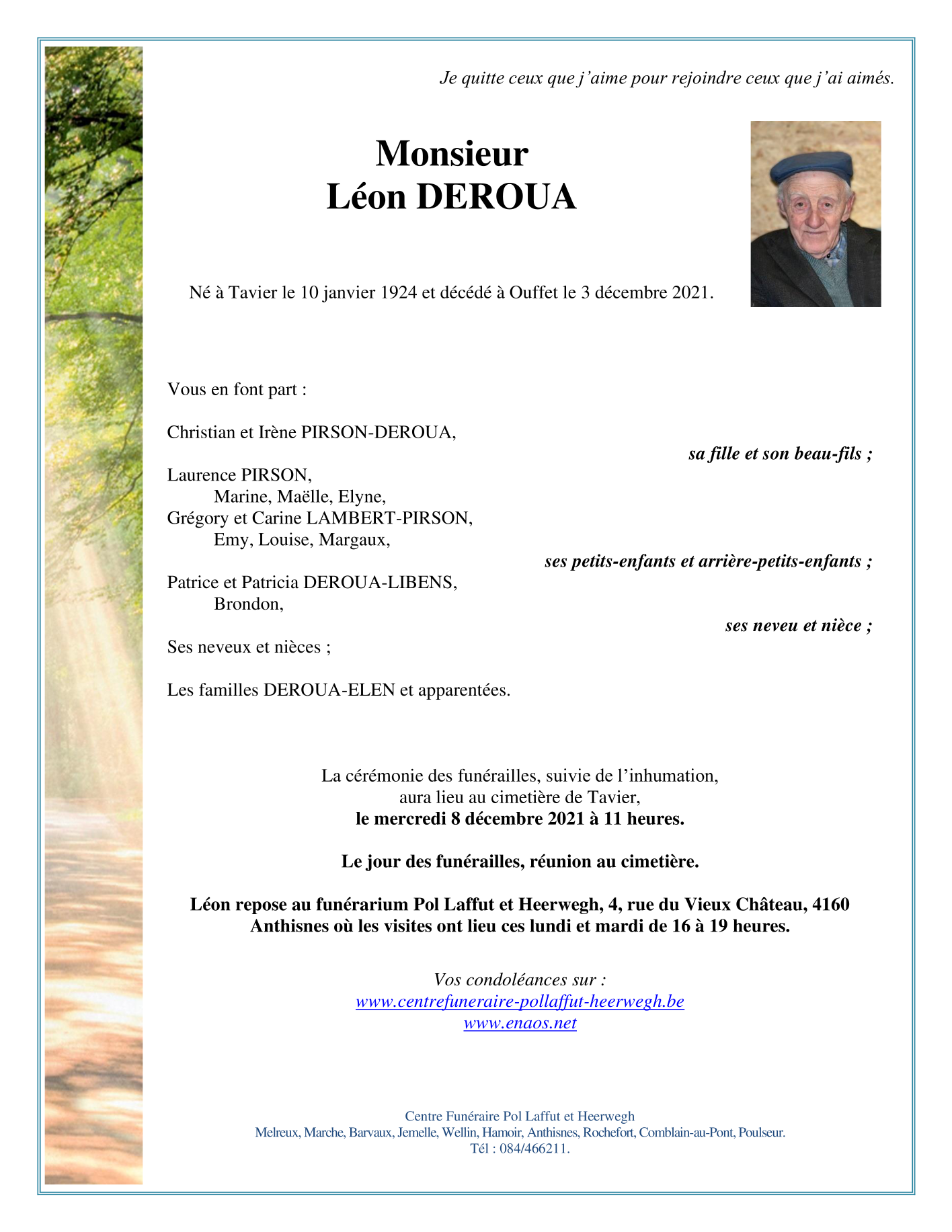 Fallecido en Ouffet (4590) el viernes, 3 de diciembre de 2021 a la edad de 97 años