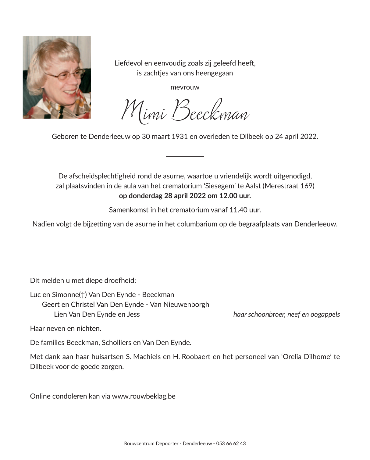 Née à Denderleeuw (9470) le lundi 30 mars 1931