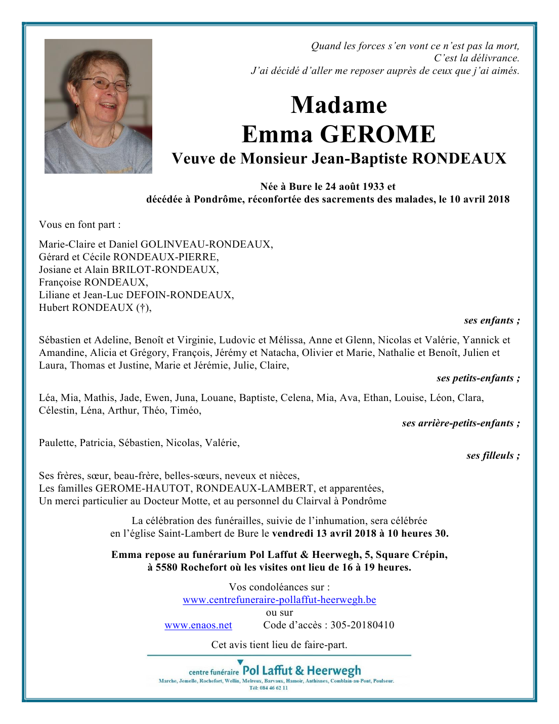 Fallecida en Pondrôme (5574) el martes, 10 de abril de 2018 a la edad de 84 años