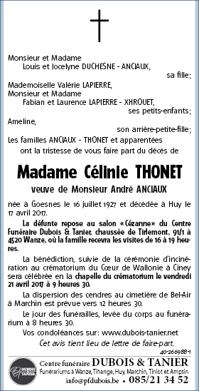 Décédée à Huy (4500) le lundi 17 avril 2017 à l'âge de 89 ans