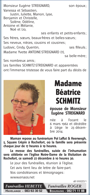 Fallecida en Liège (4000) el martes, 23 de diciembre de 2014 a la edad de 52 años