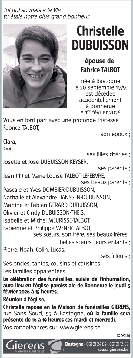 Décédée à Mabompré (6663) le dimanche 1 février 2026 à l'âge de 46 ans