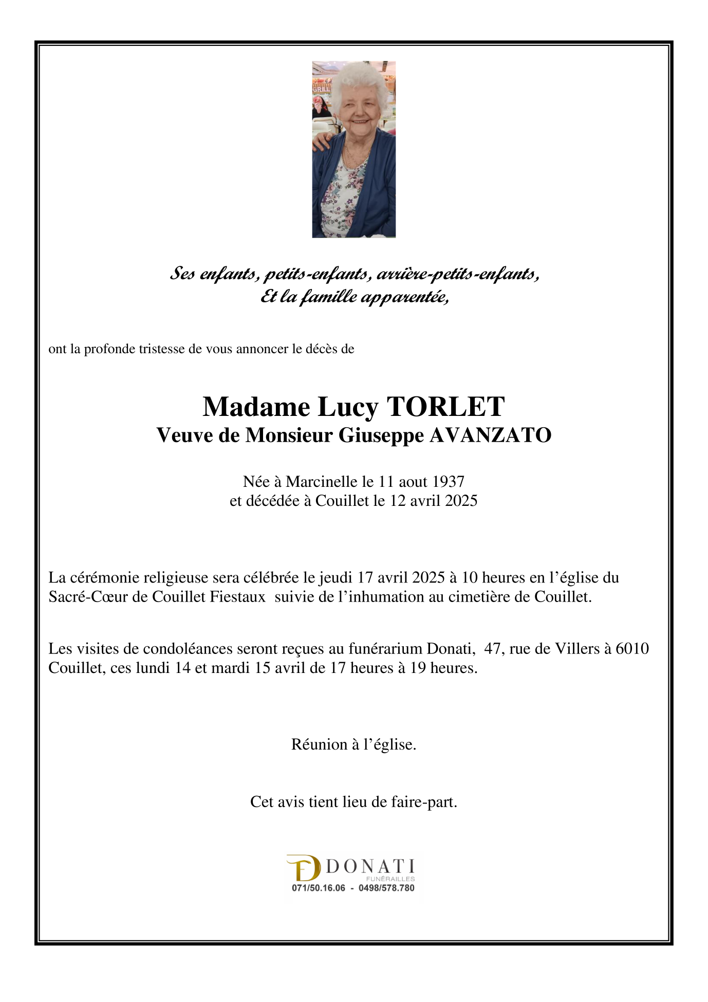Fallecida en Couillet (6010) el sábado, 12 de abril de 2025 a la edad de 87 años