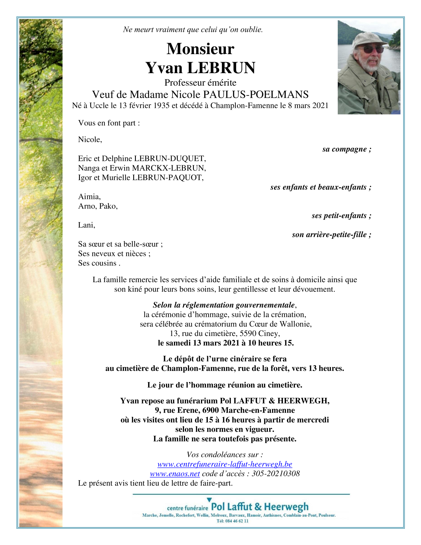 Décédé à Champlon (6900) le lundi 8 mars 2021 à l'âge de 86 ans