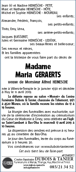 Fallecida en Huy (4500) el jueves, 11 de abril de 2019 a la edad de 89 años