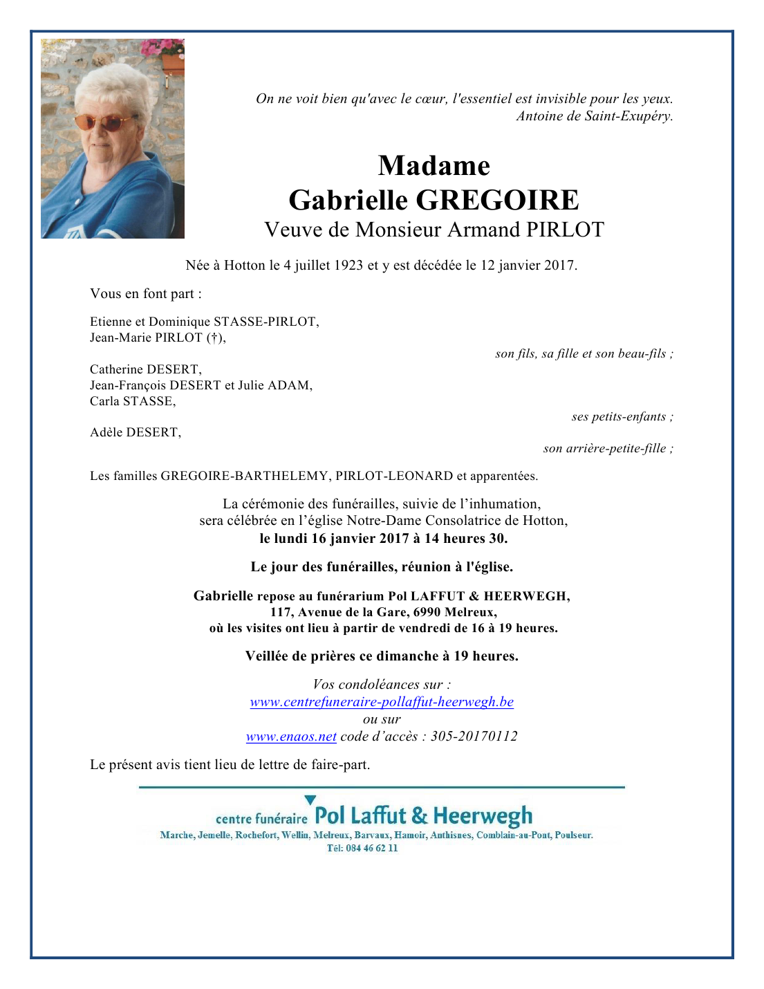 Died in Hotton (6990) on 12 January 2017 at the age of 93 years