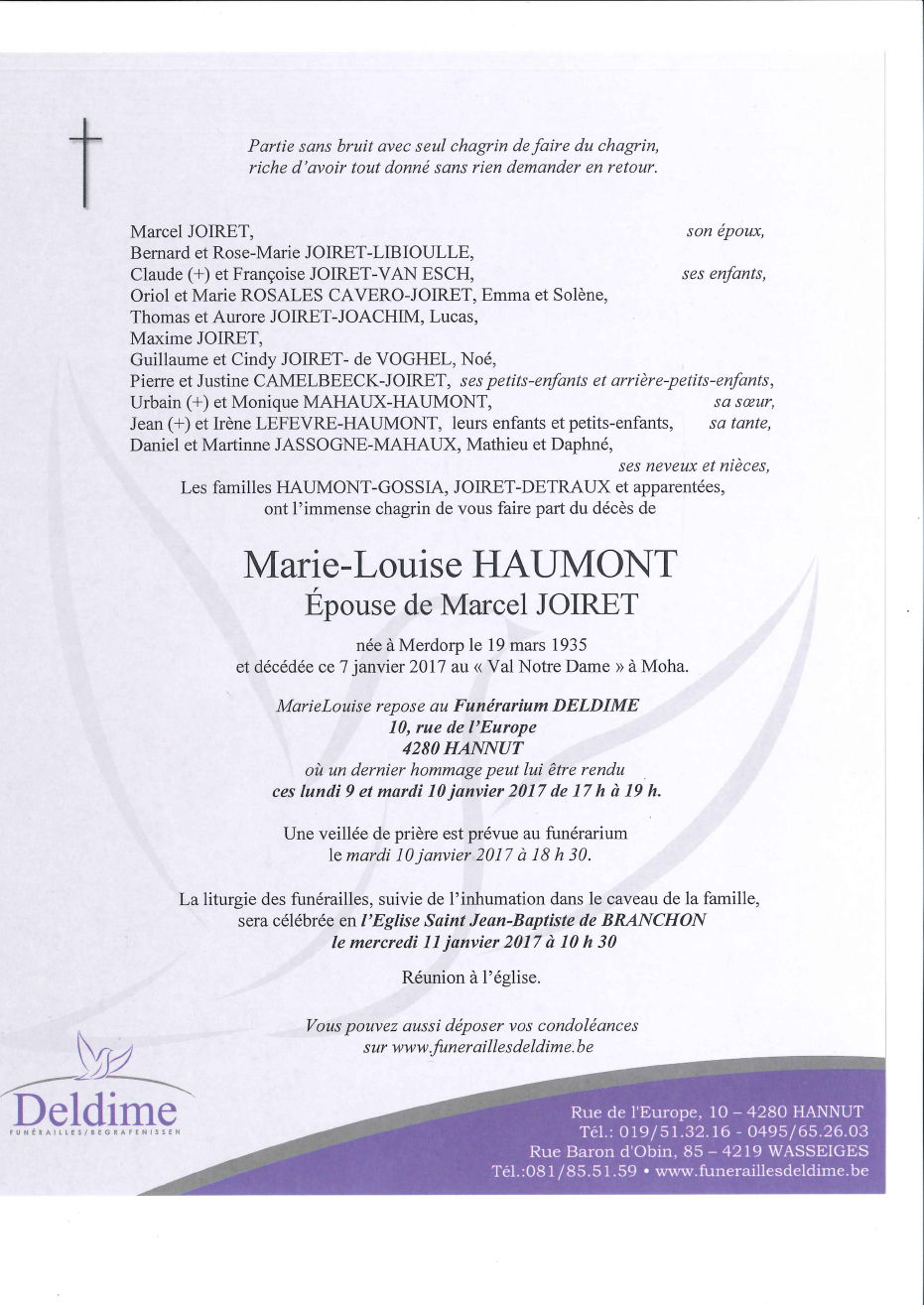 Décédée à Moha (4520) le samedi 7 janvier 2017 à l'âge de 81 ans