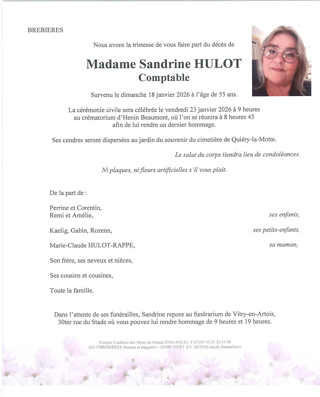 Décédée à Brebières (62117, France) le dimanche 18 janvier 2026 à l'âge de 55 ans