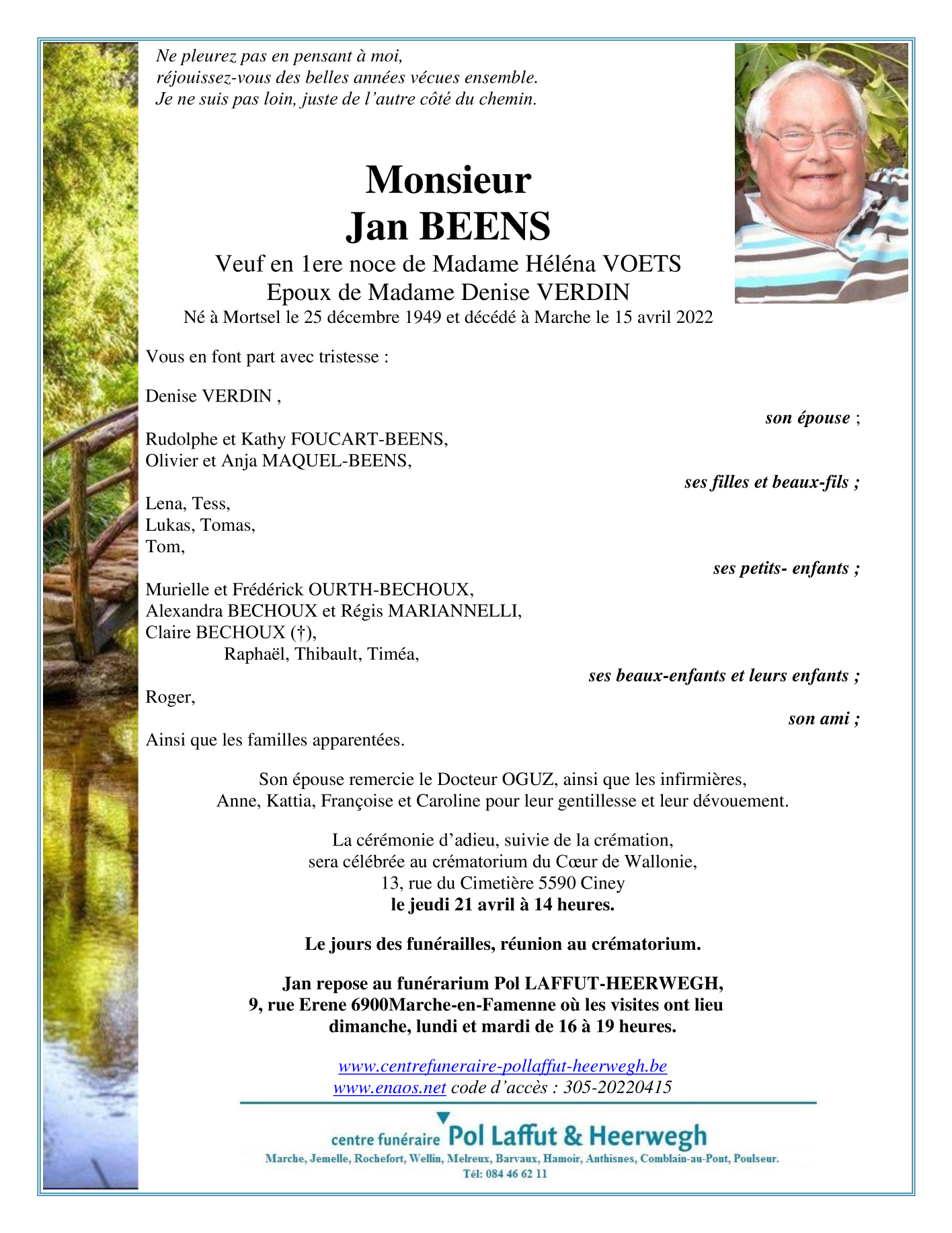 Overleden te Marche-en-Famenne (6900) op vrijdag 15 april 2022 op 72-jarige leeftijd