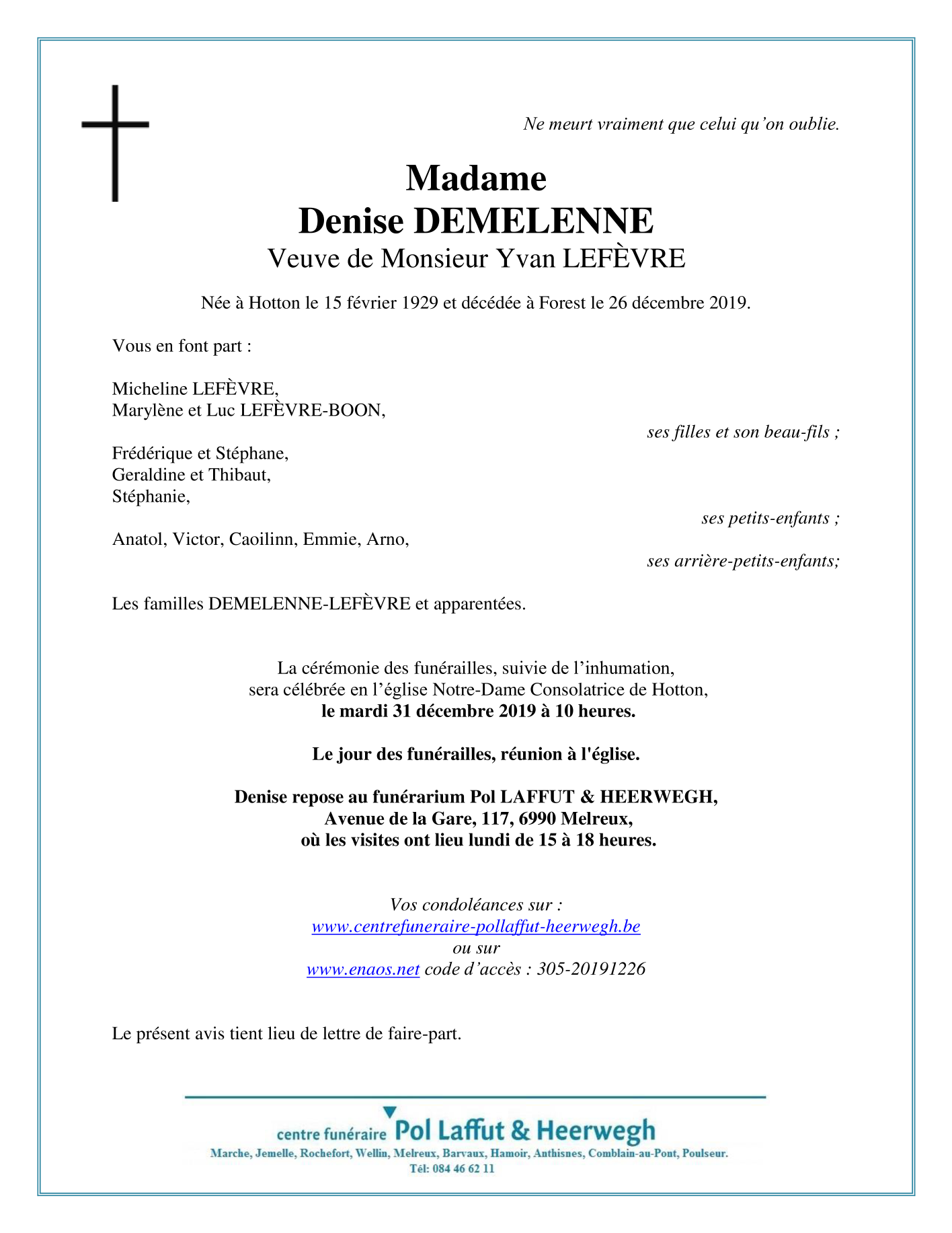Décédée à Forest (1190) le jeudi 26 décembre 2019 à l'âge de 90 ans