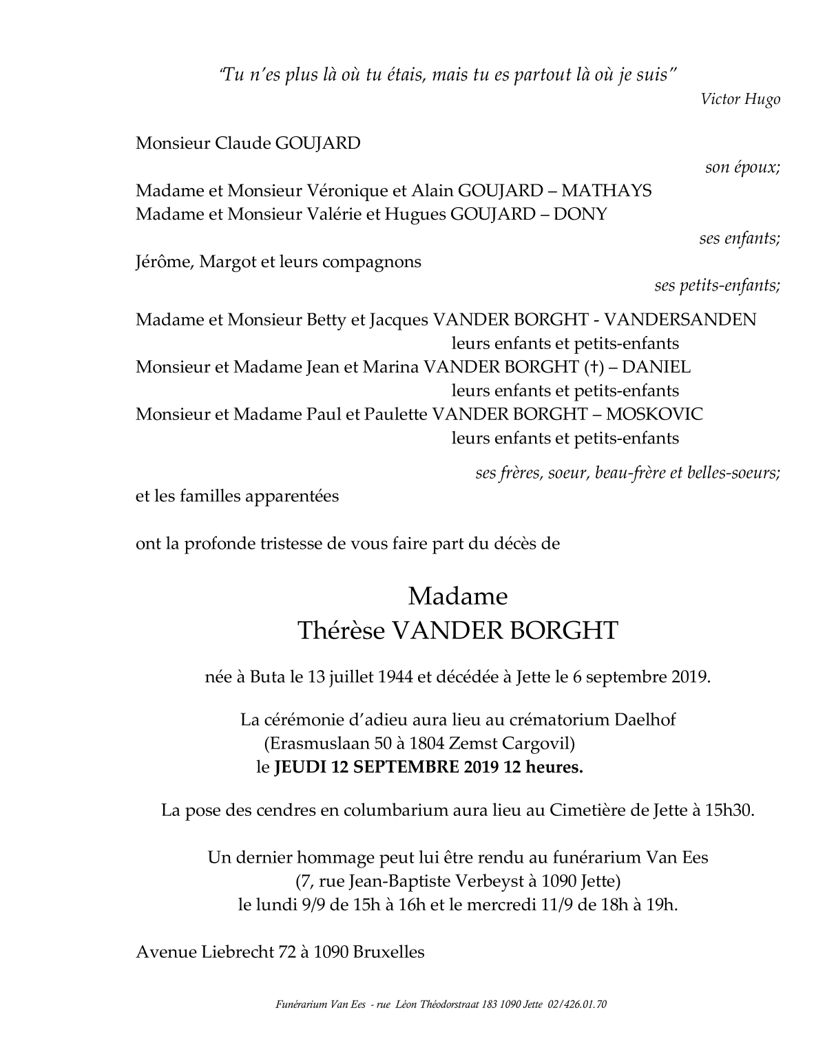 Décédée à Bruxelles (Jette) (1090, Belgique) le vendredi 6 septembre 2019 à l'âge de 75 ans