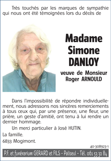 Décédée à Mogimont (6833) le jeudi 27 décembre 2018 à l'âge de 89 ans