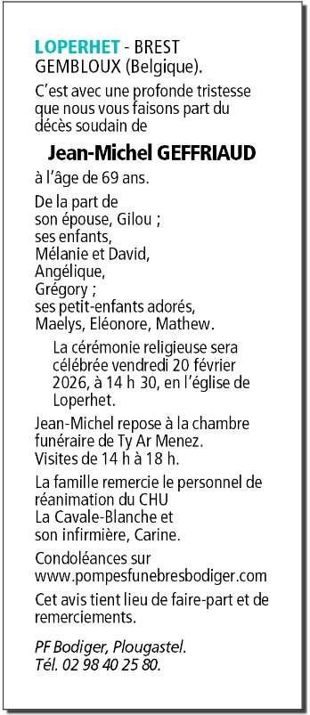| Monsieur Jean-Michel GEFFRIAUDDomiciliado en Loperhet (29470, Francia) Nacido en Nantes (44000, Francia) el domingo, 30 de diciembre de 1956 Fallecido en Brest (29200, Francia) el domingo, 15 de febrero de 2026 a la edad de 69 años Esposo de Madame Gilberte GEFFRIAUD