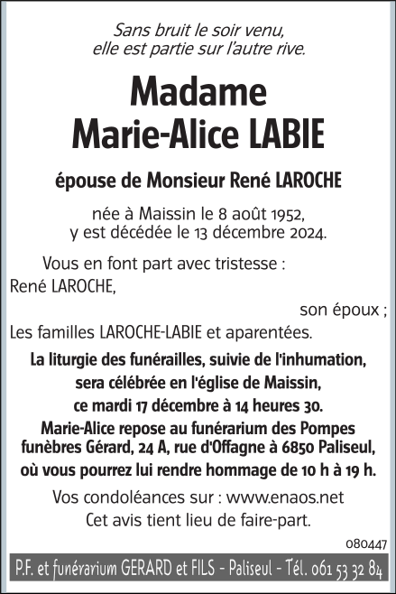 Died in Maissin (6852) on 14 December 2024 at the age of 72 years