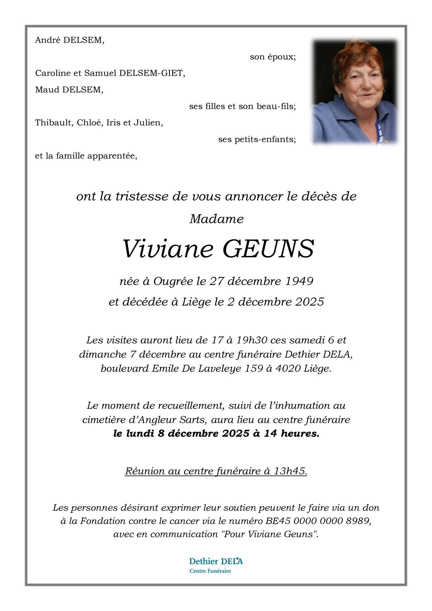 Décédée à Liège (4000) le mardi 2 décembre 2025 à l'âge de 75 ans
