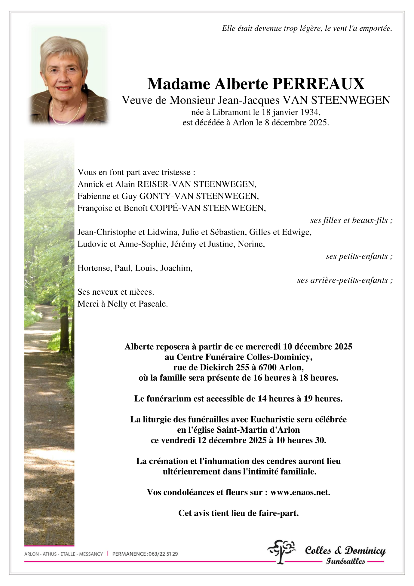 Décédée à Arlon (6700) le lundi 8 décembre 2025 à l'âge de 91 ans