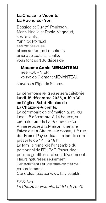 Décédée à La Roche-sur-Yon (85000, France) le mercredi 10 décembre 2025 à l'âge de 81 ans