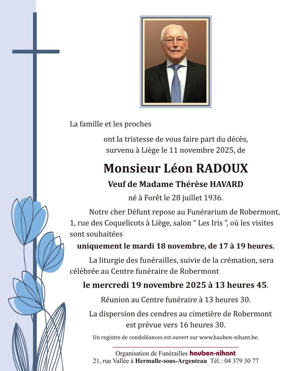 Died in Liège (4000) on 11 November 2025 at the age of 89 years