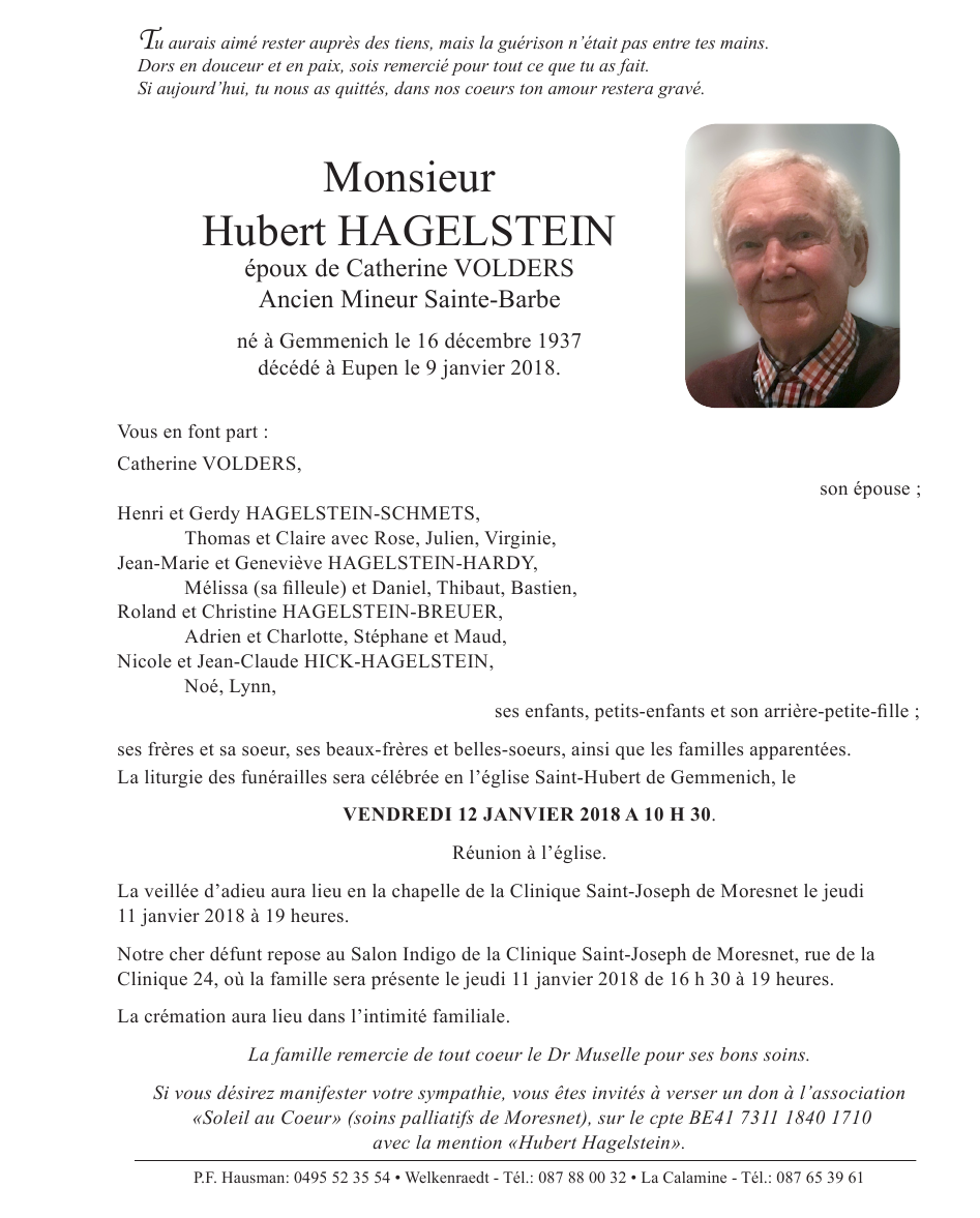 Décédé à Eupen (4700) le mardi 9 janvier 2018 à l'âge de 80 ans
