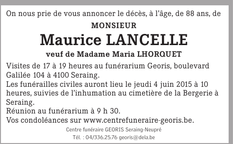 Décédé à Saint-Nicolas (Lg.) (4420) le lundi 1 juin 2015 à l'âge de 88 ans