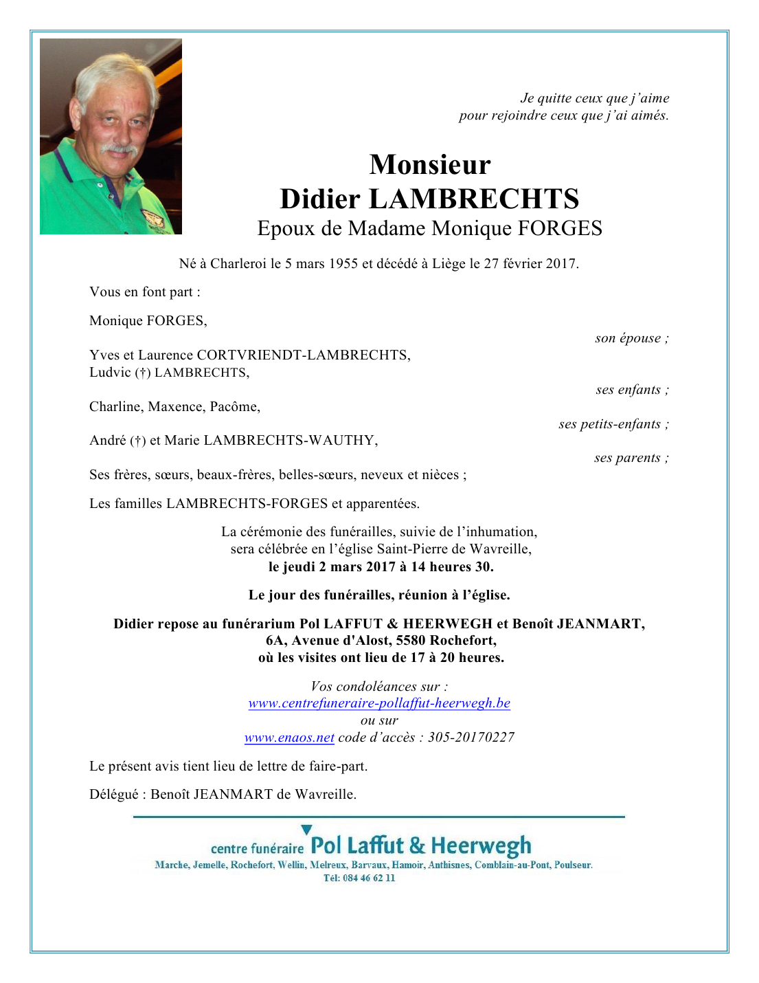 Décédé à Liège (4000) le lundi 27 février 2017 à l'âge de 61 ans