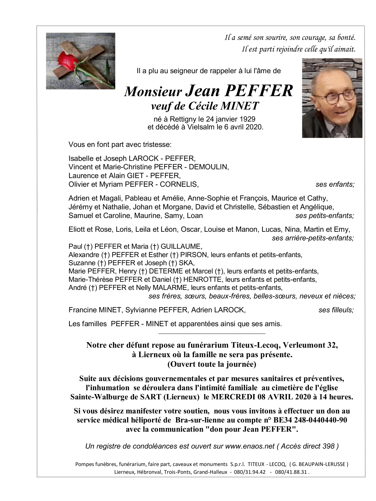 Décédé à Vielsalm (6690) le dimanche 5 avril 2020 à l'âge de 91 ans