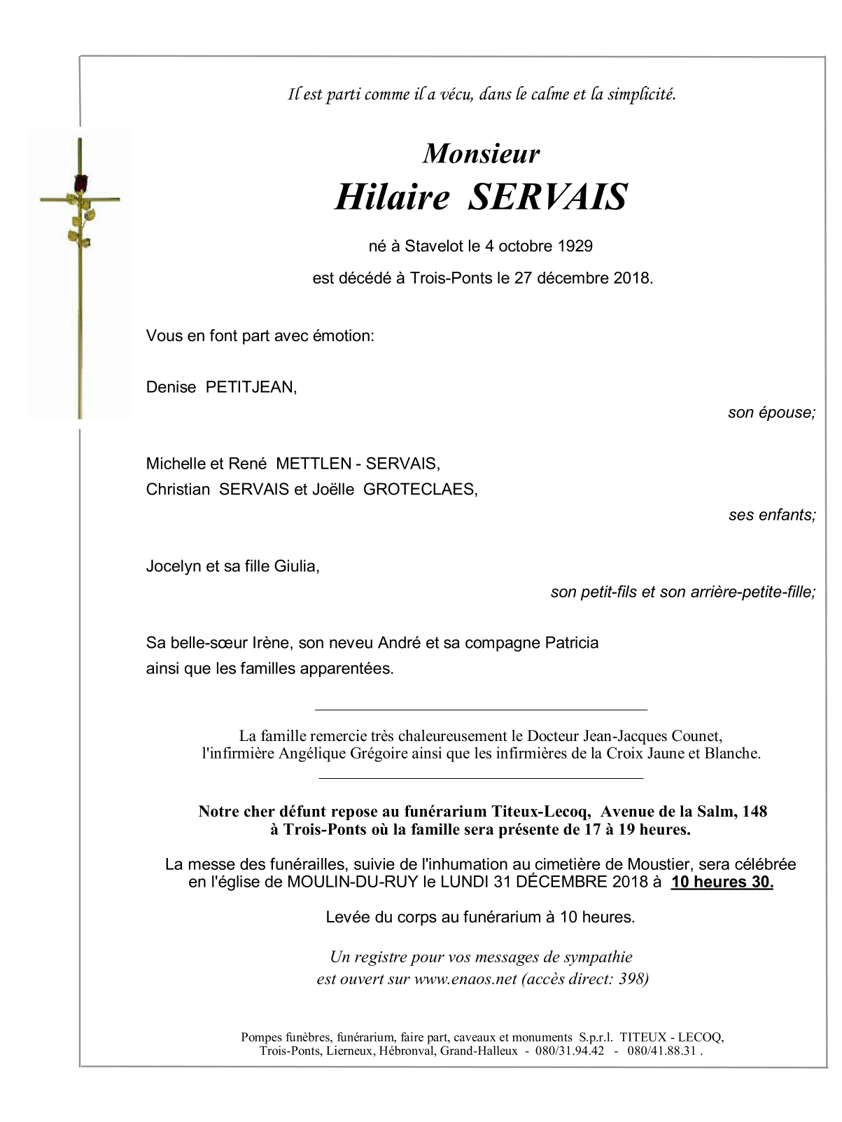 Décédé à Trois-Ponts (4980) le jeudi 27 décembre 2018 à l'âge de 89 ans