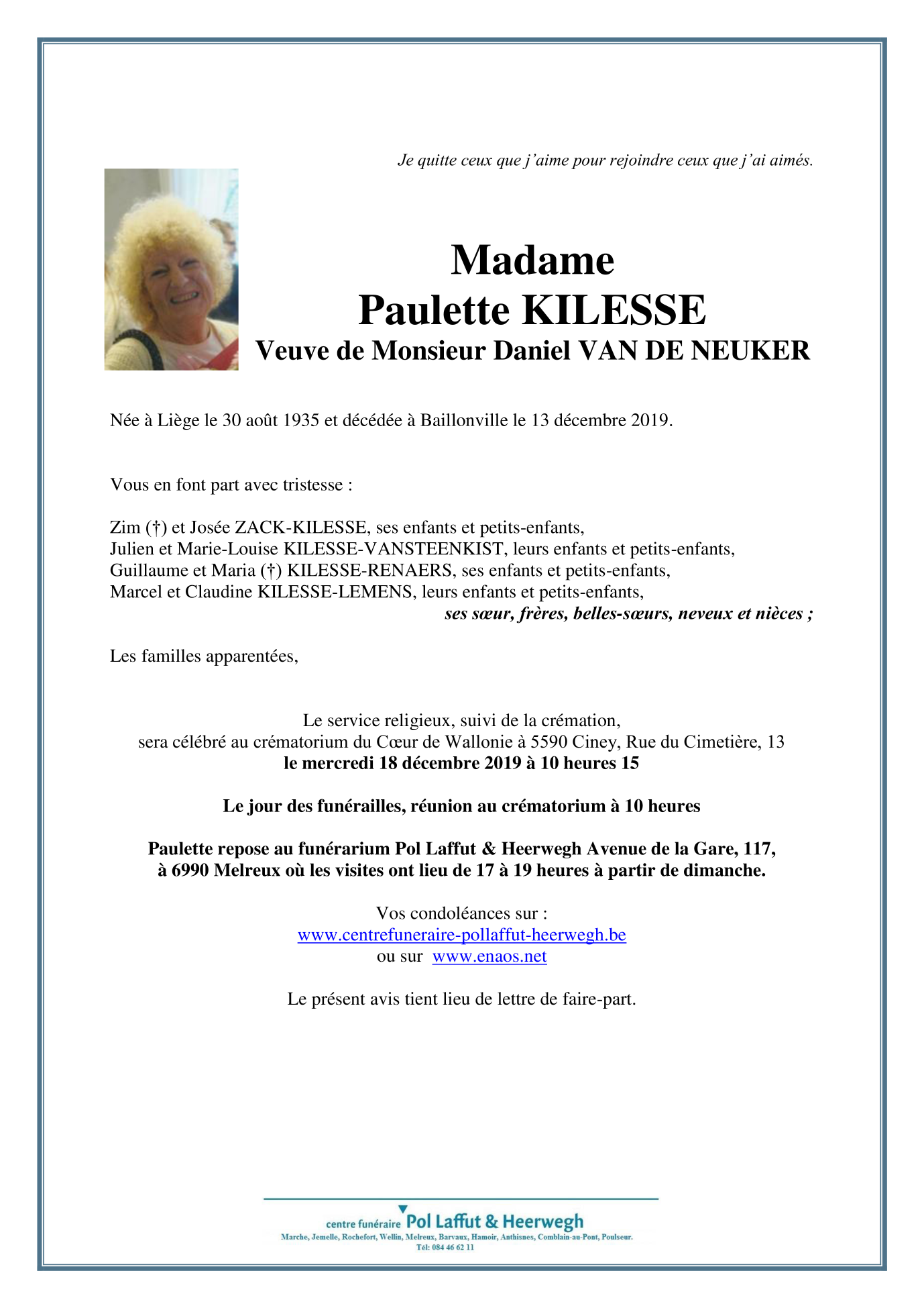 Veuve de Monsieur Daniel VAN DE NEUKER