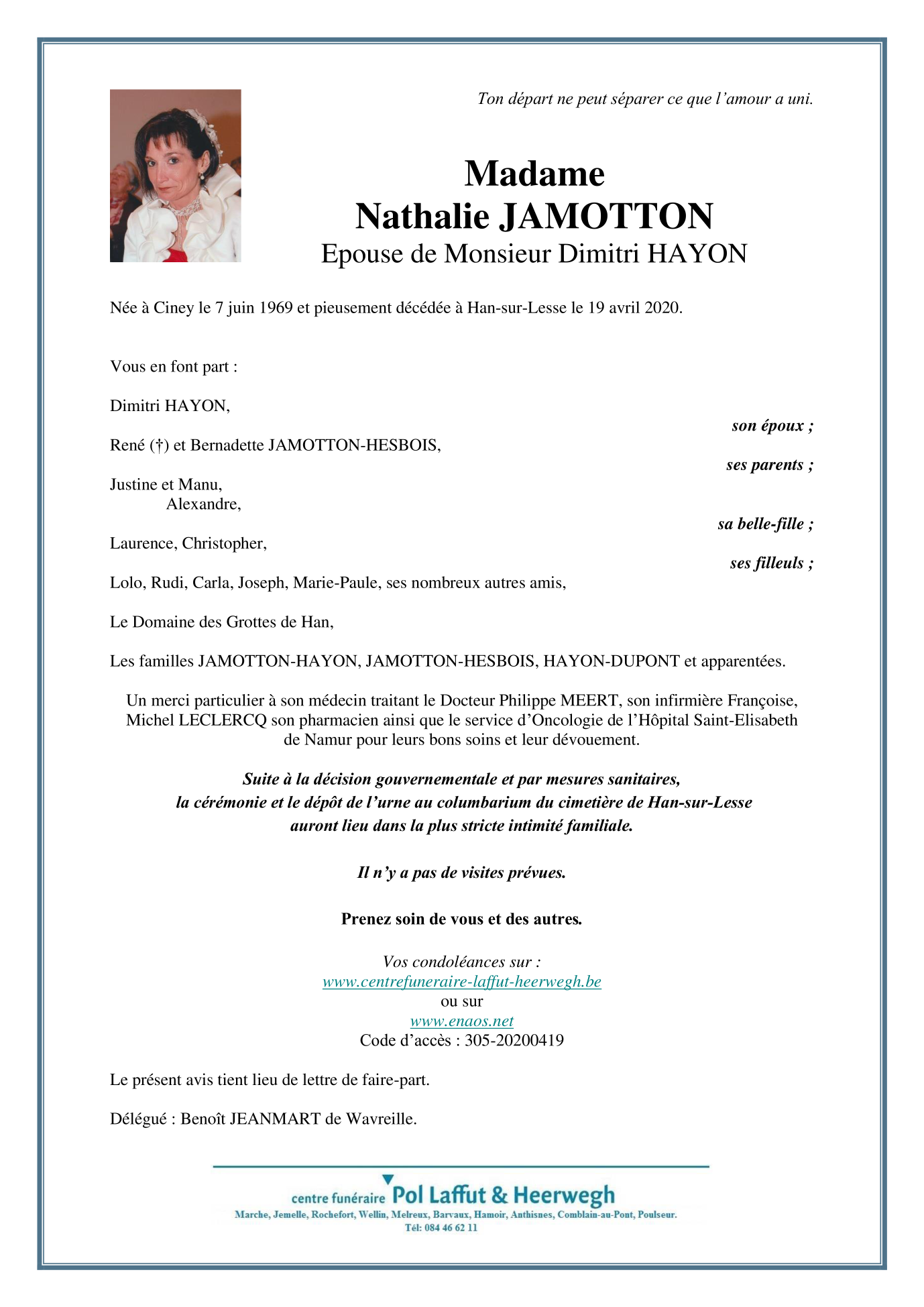 Fallecida en Han-sur-Lesse (5580) el domingo, 19 de abril de 2020 a la edad de 50 años