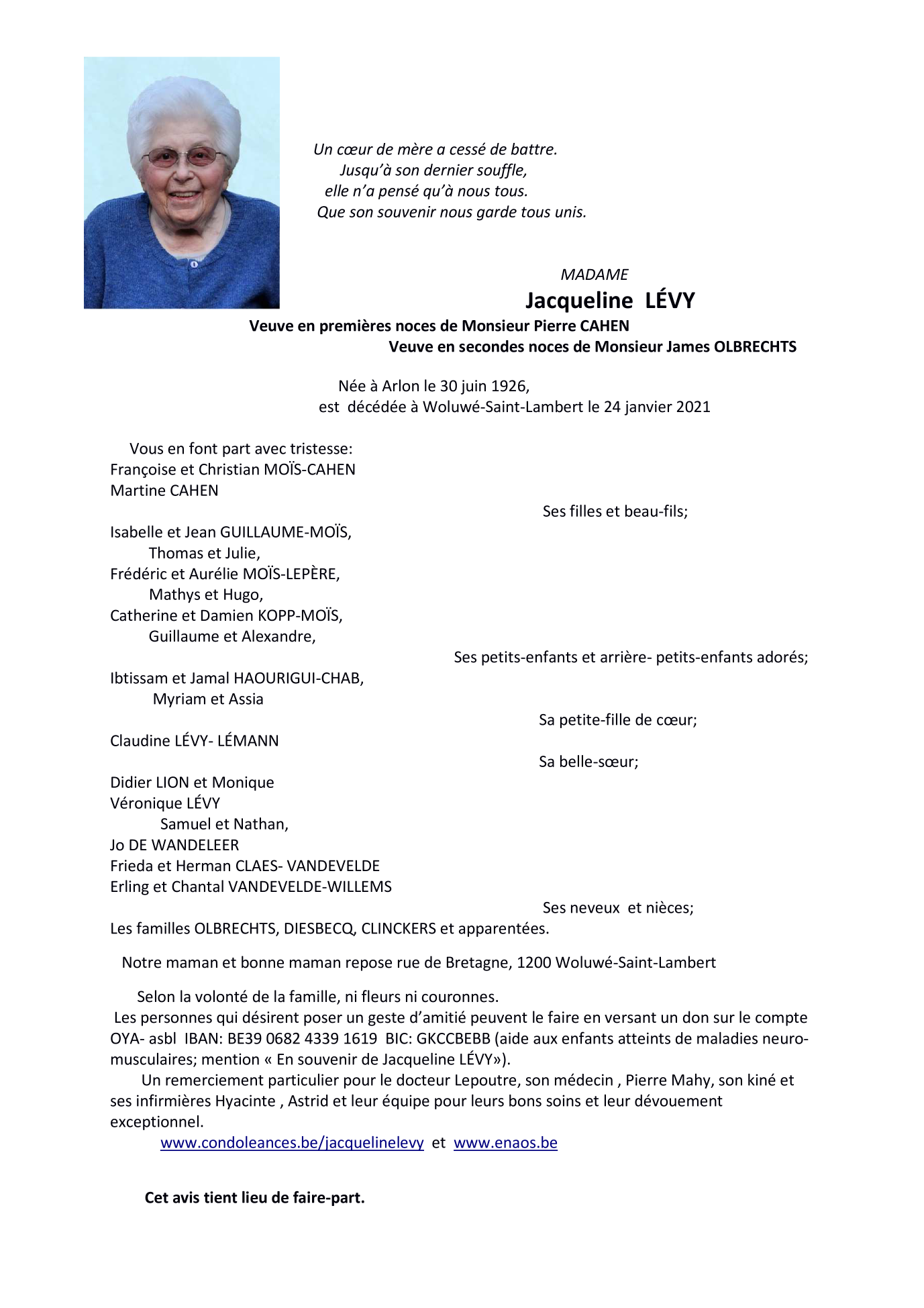 Décédée à Bruxelles (Woluwe-Saint-Lambert) (1200) le dimanche 24 janvier 2021 à l'âge de 94 ans