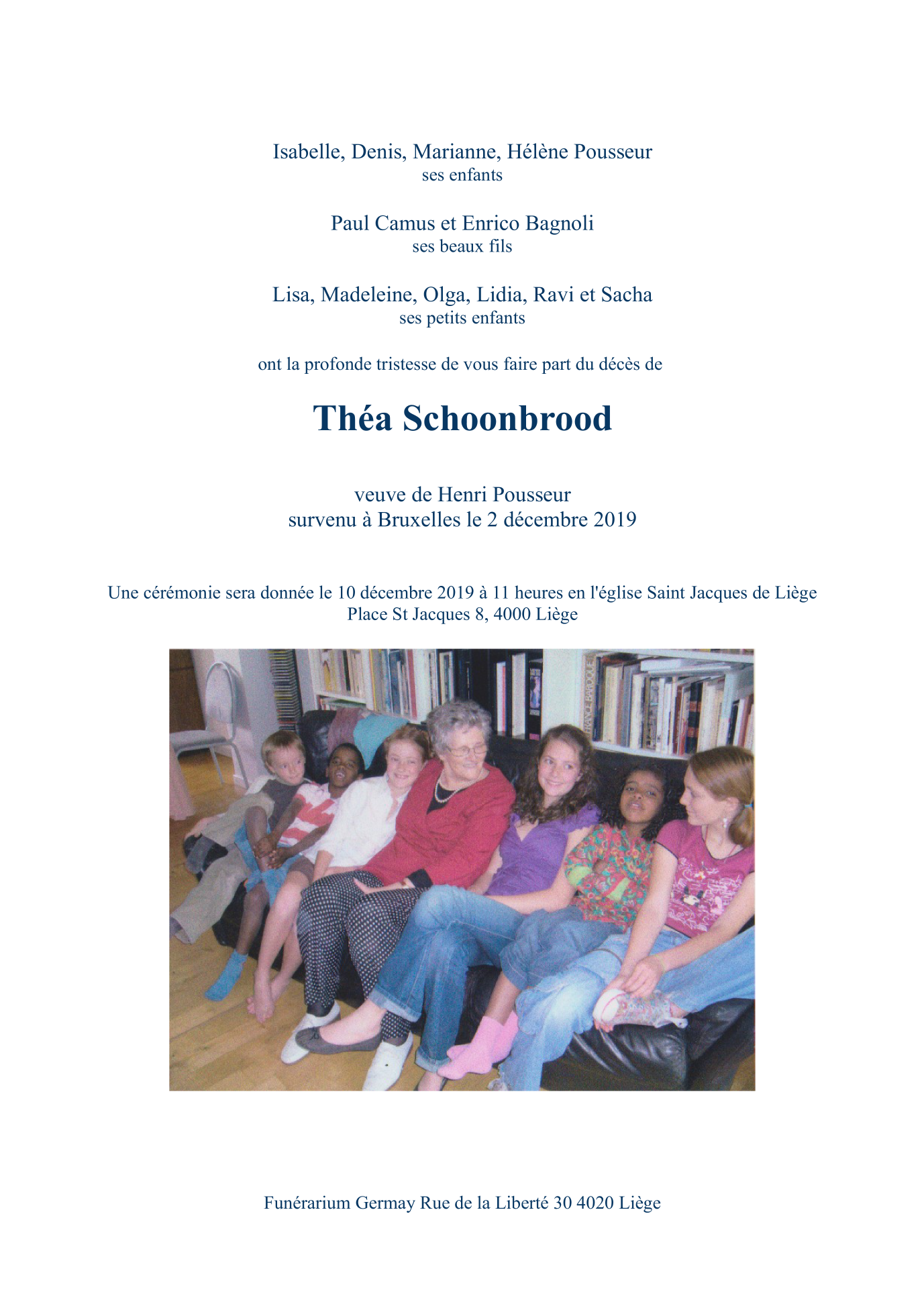 Fallecida en Bruxelles (1000) el lunes, 2 de diciembre de 2019 a la edad de 87 años