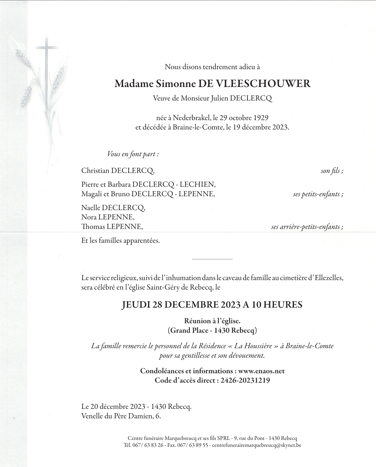 Died in Braine-le-Comte (7090) on 19 December 2023 at the age of 94 years
