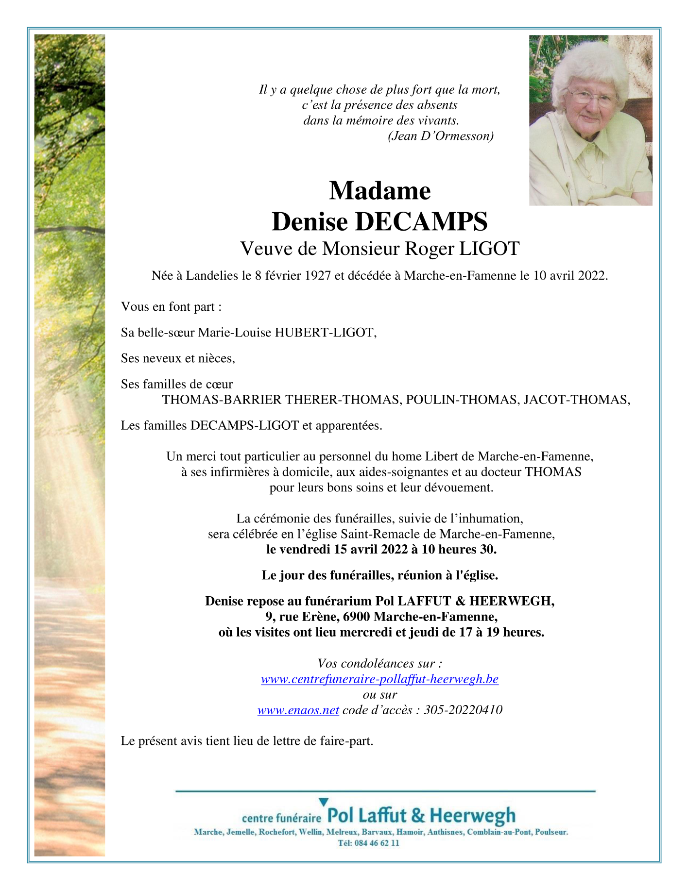 Décédée à Marche-en-Famenne (6900) le dimanche 10 avril 2022 à l'âge de 95 ans