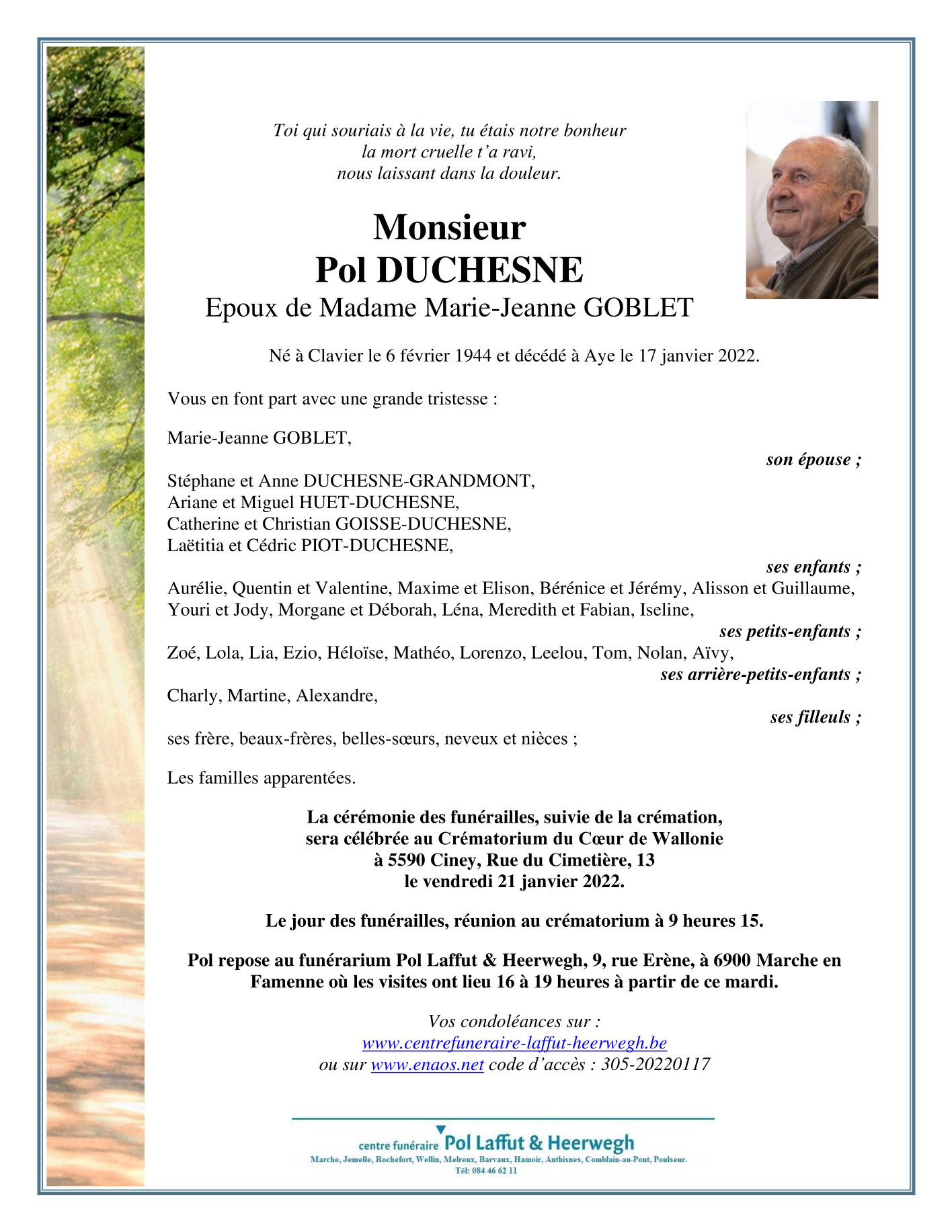 Died in Aye (6900) on 17 January 2022 at the age of 77 years