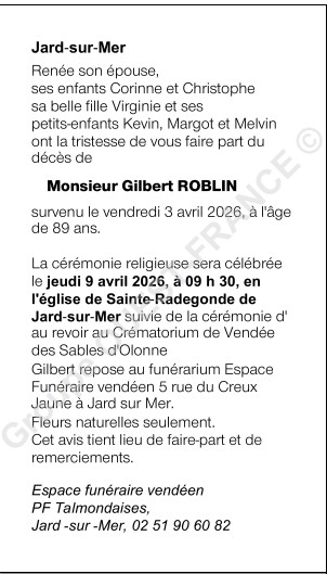 Décédé à Les Sables-d'Olonne (85340, France) le vendredi 3 avril 2026 à l'âge de 89 ans