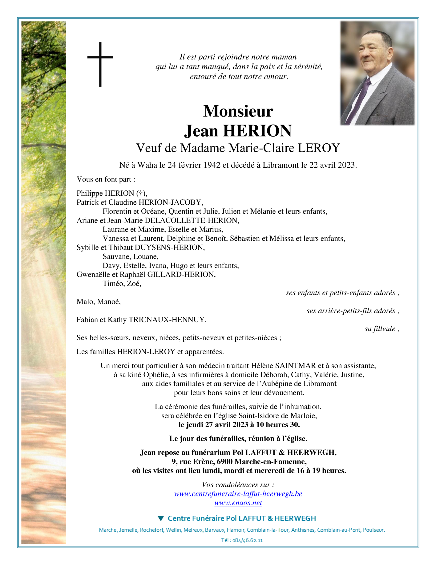 Décédé à Libramont (6800) le samedi 22 avril 2023 à l'âge de 81 ans