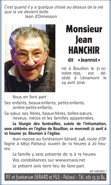 Died in Libramont (6800) on 24 April 2016 at the age of 80 years