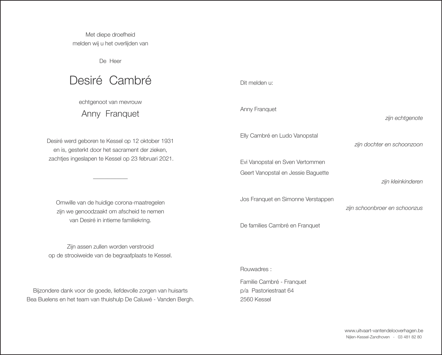 Fallecido en Kessel (2560) el martes, 23 de febrero de 2021 a la edad de 89 años