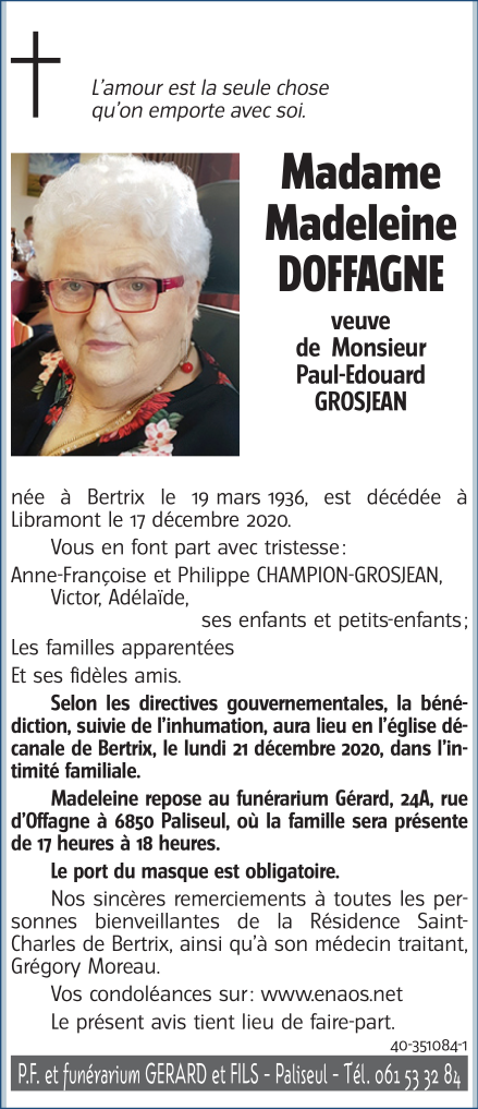 Décédée à Libramont (6800) le jeudi 17 décembre 2020 à l'âge de 84 ans