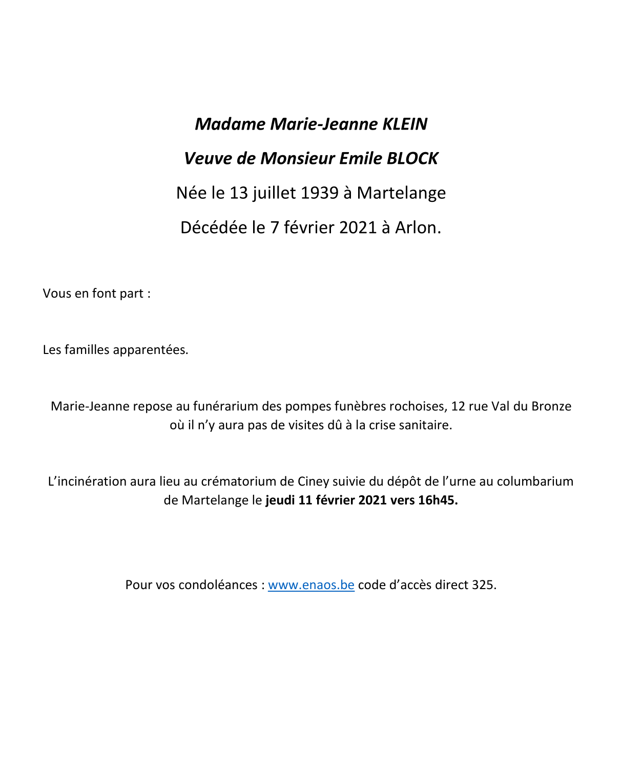 Overleden te Arlon (6700) op maandag 8 februari 2021 op 81-jarige leeftijd