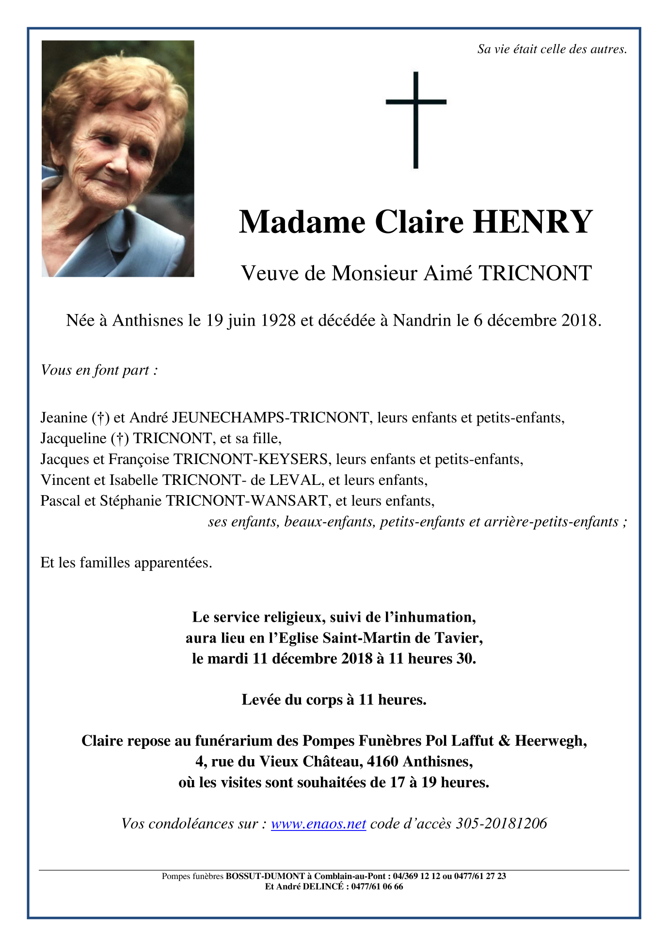 Décédée à Nandrin (4550) le jeudi 6 décembre 2018 à l'âge de 90 ans